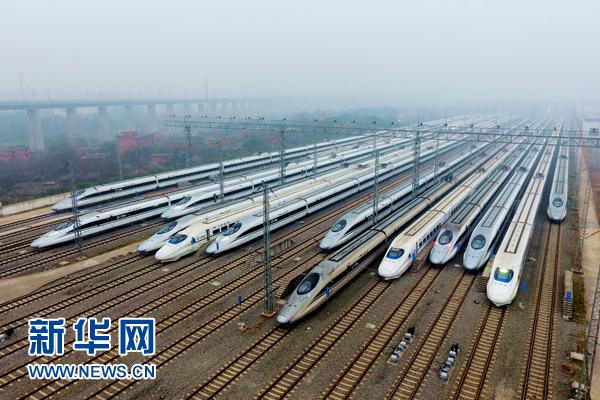 1月5日,在南昌西动车所,整装待发的动车准备出库。当日,全国铁路实行新的列车运行图。 新华社发(鲍赣生 摄)