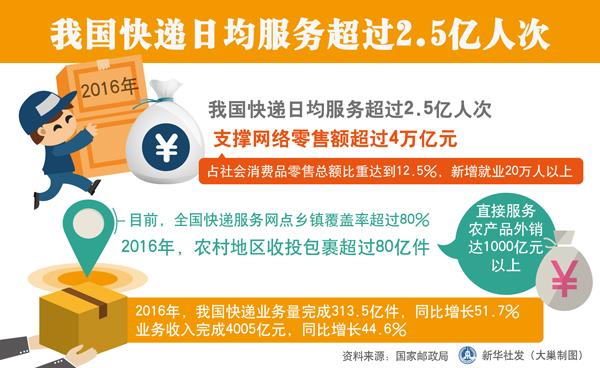 2016年,我国快递日均服务超过2.5亿人次,支撑网络零售额超过4万亿元,占社会消费品零售总额比重达到12.5%,新增就业20万人以上。