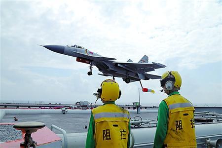 歼-15舰载战斗机放下尾钩准备着舰。莫小亮 摄