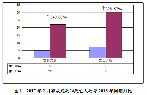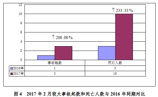 较大事故情况,2017年2月,全国共发生房屋市政工程生产安全较大事故3起、死亡10人,比去年同期事故起数增加2起、死亡人数增加7人,同比分别上升200.00%和233.33%。
