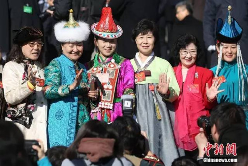 少数民族委员在会场外合影留念。 中新社记者 泱波 摄