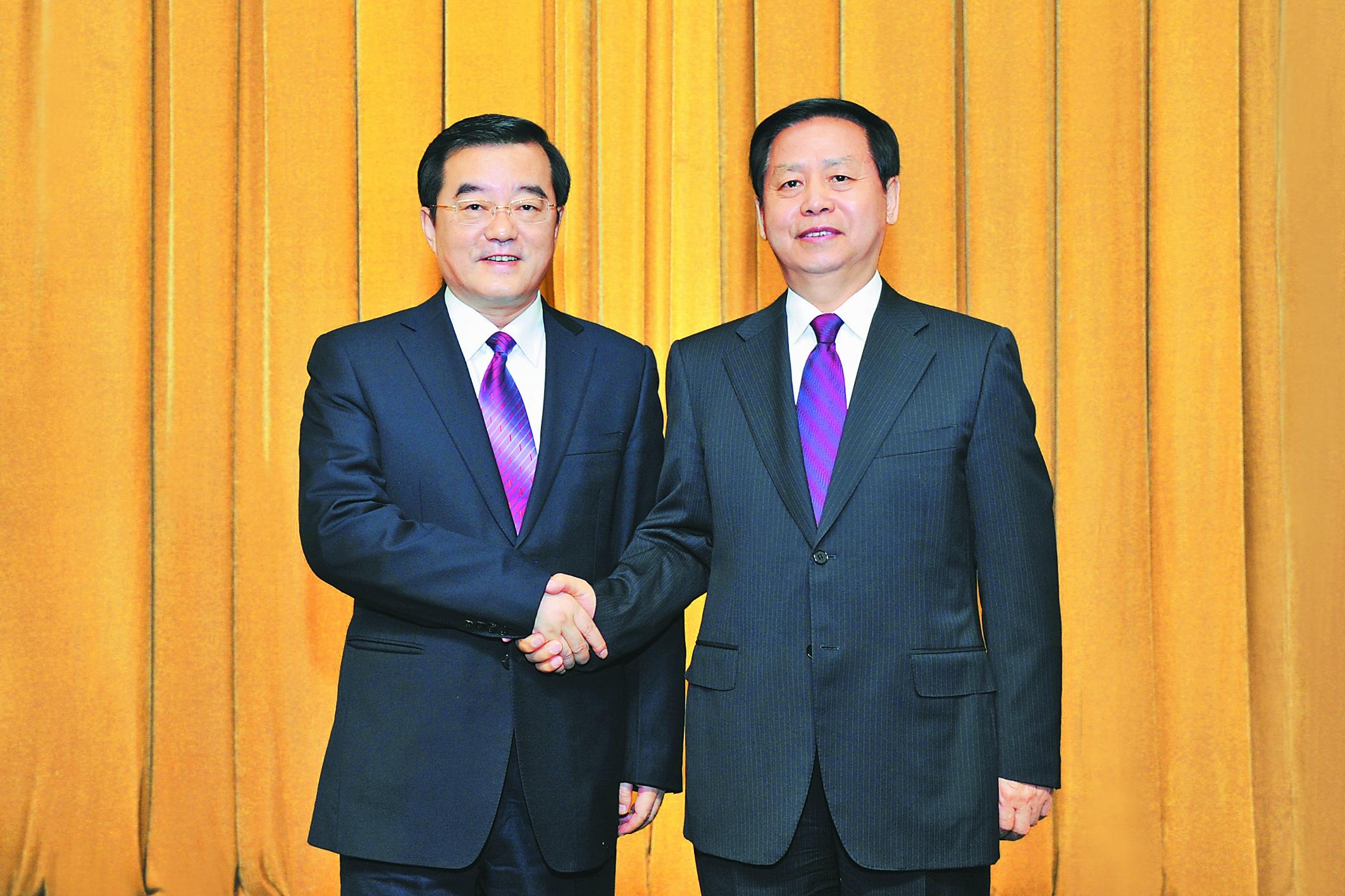 张庆伟同志与王宪魁同志亲切握手。 徐旭本报记者邵国良摄
