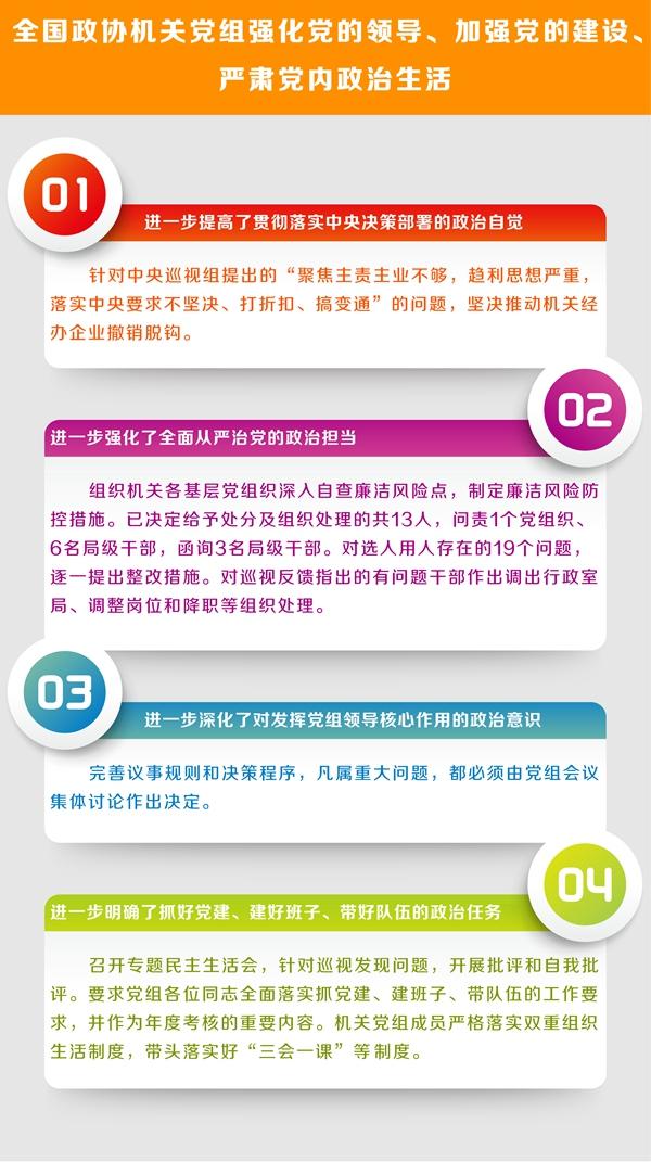 进一步强化了全面从严治党的政治担当。反思巡视反馈指出的问题,我们认识到,全国政协机关党组必须切实履行全面从严治党的主体责任,教育引导机关党员干部坚决摒弃“政协机关无权无钱不存在廉政风险”的错误认识,切实强化廉洁风险意识和责任。机关党组以这次巡视整改为契机,组织机关各基层党组织深入自查廉洁风险点,制定廉洁风险防控措施,把问题解决在萌芽状态。坚持强化监督执纪问责,严肃查处违纪违规问题。比如,在巡视整改过程中,机关党组大力支持驻机关纪检组对违规违纪问题依规依纪进行查处。截至目前,机关党组已决定给予处分及组织处理的共13人,问责1个党组织、6名局级干部,函询3名局级干部。对选人用人存在的19个问题,逐一提出整改措施。对巡视反馈指出的有问题干部作出调出行政室局、调整岗位和降职等组织处理。