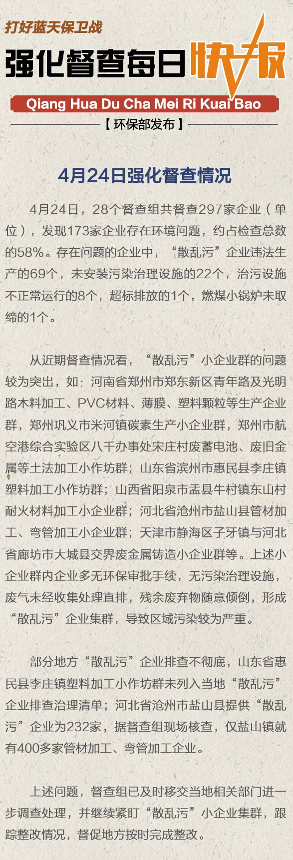 中新网4月25日电 据环境保护部宣传教育司官方微博消息,4月24日,28个督查组共督查297家企业(单位),发现173家企业存在环境问题,约占检查总数的58%。