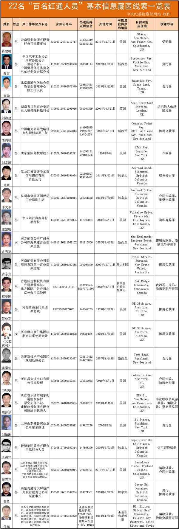 22名"百名红通人员"基本信息藏匿线索一览表