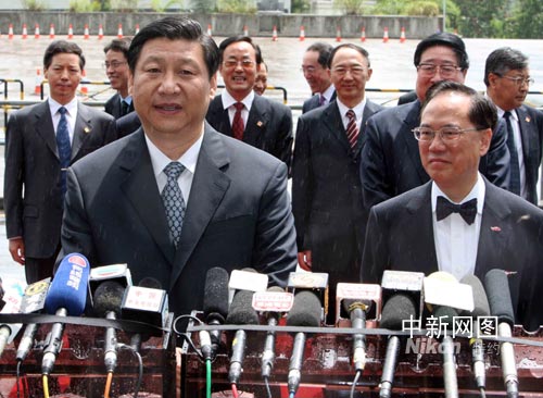 中新网7月6日电 中国国家副主席习近平6日上午乘车经落马洲抵港,香港特区行政长官曾荫权冒雨迎接。习近平抵港后发表简短讲话,表示今次来港会实地考察奥运马术比赛设施,并体会香港回归11年后的变化。