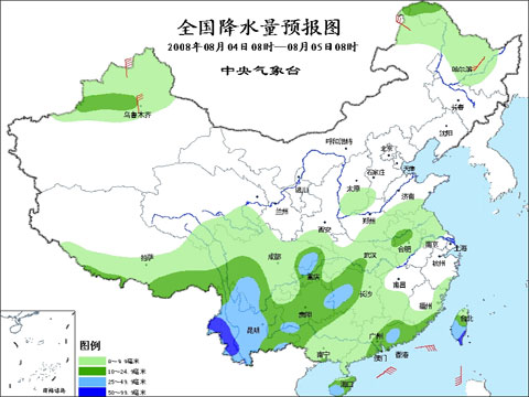 8月4日08时至5日08时,新疆西北部、西藏东部和南部、青海东南部、陕西南部、内蒙古东北部、黑龙江中北部、黄淮中南部、江淮大部、江汉大部、江南西部、华南大部、西南地区大部有小到中雨或雷阵雨,其中,重庆中北部、四川南部和东部部分地区、贵州东部和南部部分地区、湖南西部部分地区、云南中西部、广东南部部分地区、海南南部以及台湾东南部等地的部分地区有大雨,局地有暴雨,上述部分地区并将伴有短时雷雨大风等强对流天气。新疆北部有5~6级偏北风,内蒙古东北部、东北北部有4~5级偏北或偏南风;南海北部有6~7级偏南或偏北风。
