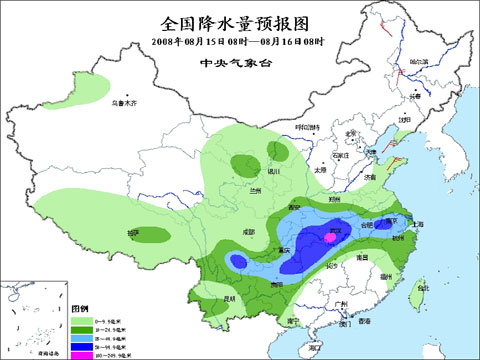 2008年8月15日8时-16日8时全国降水量预报图