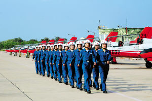 银白色头盔,天蓝色飞行服,在红白相间的战鹰映衬下,整装待发的女飞行学员显得英姿飒爽。“开车!”随着指挥员、飞行大队长孙光辉一声令下,刹那间,发动机轰鸣震天撼地,战鹰依次滑进跑道,以雷霆万钧之势直冲云天。