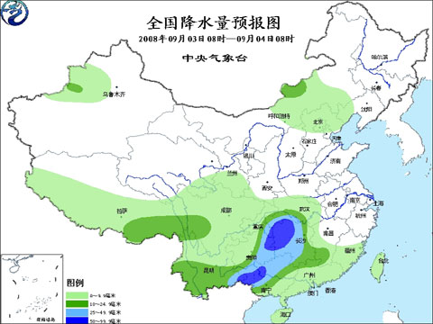 9月3日08时至9月4日08时,新疆西部、西藏南部和东部、青海东南部、甘肃南部、内蒙古东部、陕西南部偏南地区、山西东北部、河北北部、辽宁西部、湖北大部、湖南、江西西部和南部、福建南部、西南地区大部、华南大部等地有小到中雨或雷阵雨,其中,湖北西南部、湖南大部、贵州东部、广西北部和西部、云南东南部等地的部分地区有大雨或暴雨,上述部分地区并将伴有短时雷雨大风或冰雹等强对流天气。