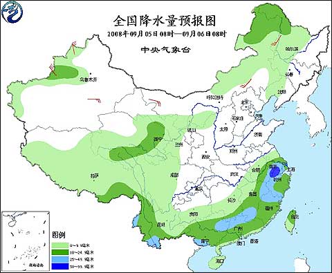 2008年9月5日8时—9月6日8时全国降水量预报图