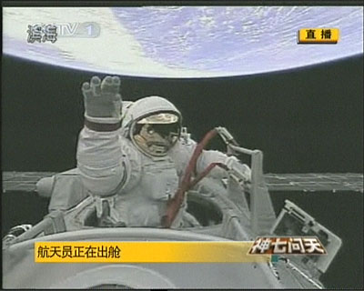 翟志刚以头先脚后的方式进入太空,16时44分,他声音洪亮的向地面报告:“神舟七号已出舱,身体感觉良好,向全国人民,向全世界人民问候。”
