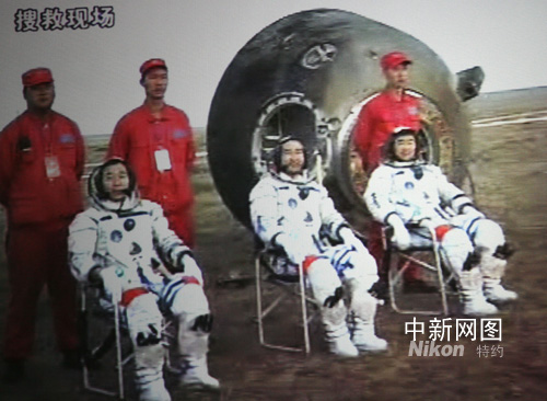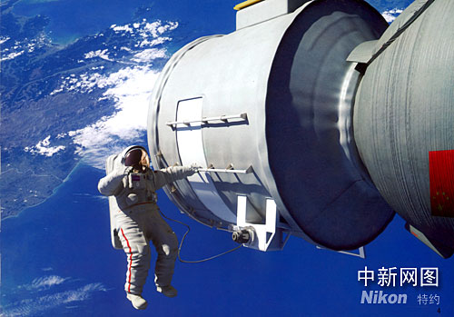 23时36分许:翟志刚着中国自主研发的“飞天”舱外航天服在太空首次亮相。