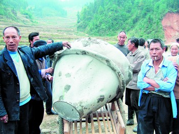 绥宁县人武部将坠落在黄土矿乡自然村三组稻田中的火箭残骸成功回收。 彭超 摄