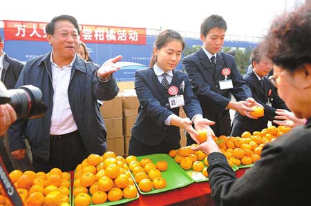 昨日(2日)上午,农业部副部长陈晓华、副省长张作哈、省农业厅厅长任永昌来到成都春熙路街头广场,带头吃下蜜柑,以此消除人们品尝柑橘的顾虑。昨日由省农业厅、成都市农委、成都市商务局共同主办的“万人免费品尝柑橘活动”在全市各大超市举行。全省各柑橘主产地也同时开展了免费品尝活动。