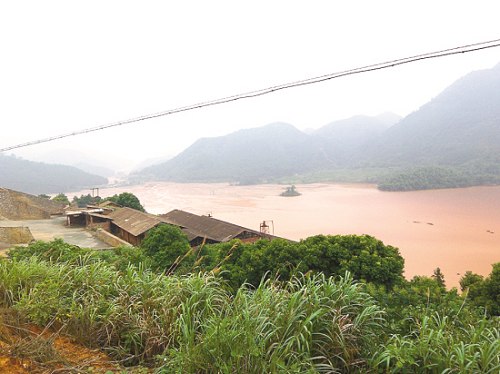 在两坝之一的铁龙拦泥坝上,记者看到,酱黄的洗矿水从矿山奔流而下,虽然被刚刚加高的坝子拦住,暂时停歇、沉淀析离出部分泥沙,再从一侧的出水口迂回流入横石河,但依然是鲜艳的红黄色。一位生态环境与土壤专家指着直泻的红黄瀑布,告诉记者:“大坝加高后,据说可以增加100万立方米的库容,但水中含有重金属,水呈强酸性,根本就不会跟着泥沙沉淀在拦泥坝里,而依然会毒害整个流域的植物、动物和人。”