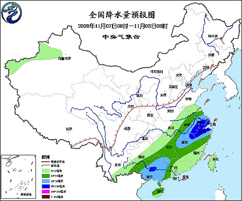 2008年11月7日8时—11月8日8时全国降水量预报图