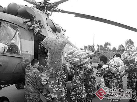 由于受灾较严重的地区均属于偏远高寒山区,通往灾区的道路全部中断,短期之内无法抢通,为及时将灾区急需的大量救援物资送达灾区,楚雄彝族自治州请求省人民政府给予协调直升飞机支援灾区救援。省人民政府接到请求后,协调由成都军区的3架直升机参加支援楚雄州重灾区应急救灾工作。