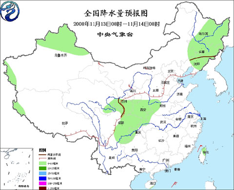 2008年11月13日8时—11月14日8时全国降水量预报图