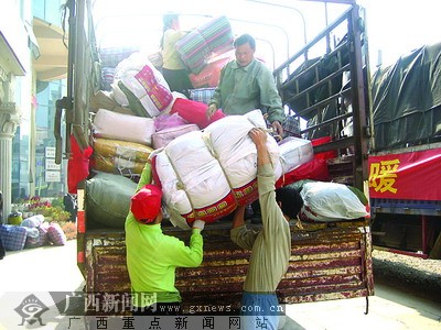 12月1日,6万余件冬衣、4000余床棉被和200余床毛毯被装车运往上思、宁明等6个受灾地区。这是我区今年下发的第一批冬令救灾物资。