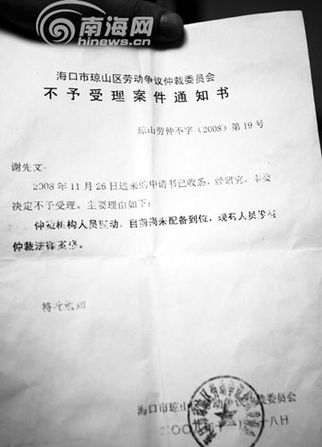 据了解,谢先文在海口某家具厂打工期间,不慎被电锯割伤拇指,其不服老板给予的3000元补偿,于11月26日向海口市琼山区劳动争议仲裁委员会提出仲裁申请,28日这天收到该仲裁委的一纸不予受理通知书。记者在通知书上看到:“不予受理主要理由如下:仲裁机构人员变动,目前尚未配备到位,现有人员没有仲裁法律资格。”“我既没有过诉讼失效,也没有越级申诉,完全按照法律程序维权,没想到仲裁委的工作人员会没有从业资格,那我该向什么部门申诉?”谢先文拿着通知书气愤地说。