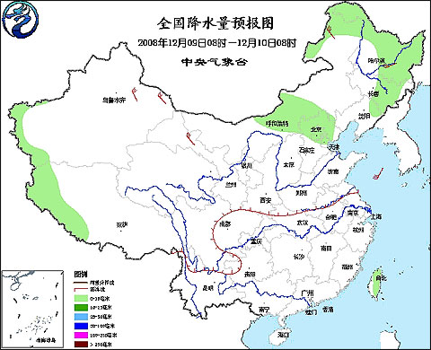 2008年12月9日8时—12月10日8时全国降水量预报图