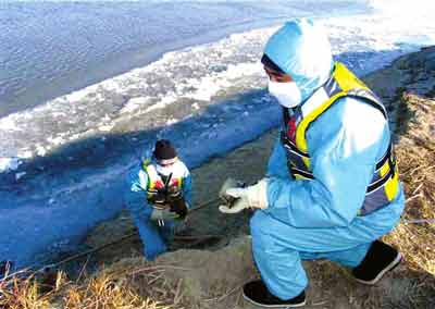 2005年11月27日,哈尔滨水文水质检测人员在松花江哈尔滨段取样检测。 2005年11月13日,中石油吉林石化公司双苯厂发生爆炸事故,造成大量苯类污染物进入松花江水体,引发重大水环境污染事件。这一事件给松花江沿岸特别是大中城市人民群众生活和经济发展带来严重影响。时任国家环保总局局长解振华辞职。新华社特供本报图片