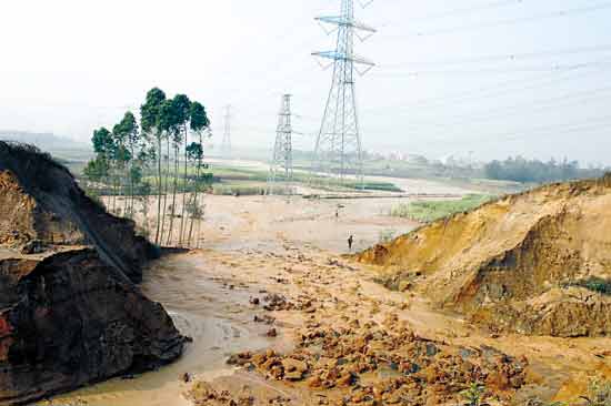 昨天上午,记者接到报料后立即赶赴现场,看见大批抢险人员正在运河上抢险救灾。雷州青年运河遂溪至湛江的东海河平岭河段决口处在广湛高速公路源水出口附近,运河的河床塌方有10多米深,险段长250多米,决口80米宽,运河水不停地灌入西南面农田,农田受浸。据遂溪县有关部门统计,茅村和源水两村委会六条自然村农田受浸面积达数百亩。而现场被冲掉的土方达3万立方米。