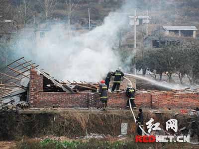 冷水江市岩口镇农科村一鞭炮厂仓库被炸为废墟。