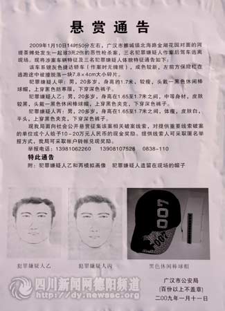 13日上午,记者在广汉各大街道、小区看到,广汉市公安局贴出了悬赏通告,向社会公开悬赏征集广汉市“1.10”恶性枪杀案相关破案线索,对提供重要线索的单位或者个人,将给予10-20万人民币现金奖励。提供线索人可以匿名举报方式。举报电话:13981062260、13908107528、0838-110(记者 李安国)