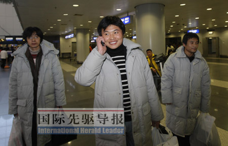 2月25日上午10点,刚抵达北京首都国际机场,这位获救中国船员做的第一件事就是打电话给爸妈报平安,站在他身边的是另外两位获救船员刘峰、宋进。短暂的停留后,三位归心似箭的山东老乡又搭上飞往青岛的航班。