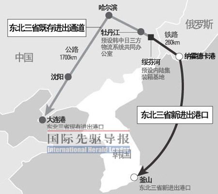 这是东北最大最繁忙的航线。韩国《朝鲜日报》近日报道,中国、韩国和俄罗斯正联手构建新的“中韩俄三角物流系统”。一座20万平方米的内陆集装箱货场将在黑龙江省绥芬河市落成,中国北方的进出口货物将悉数集中在这里,然后用铁路运往俄罗斯纳霍德卡港,通过海运运到韩国釜山港。
