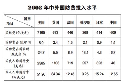 首先,应当看到中国国防费的投入是适度有限的。近年来,中国的国防费有了较大幅度的增长,似乎中国的国防费已经很多了,但如果以历史的、联系的,而不是以孤立的、片面的观点,来审视和分析中国的国防费问题,就会得出一个中国的国防费投入实际上并不多的客观结论。从历史上看,中国国防费投入的增长带有明显的补偿性。根据国家统计局有关公开资料,从1979年到1989年,国防费平均增长为1.23%,与同期居民消费价格总指数平均上涨7.49%相比,实际年平均负增长超过6%。从1990年到1997年国防费年均增长15.8%,而同期居民消费价格总指数平均上涨9.7%,中国国防费排除物价因素后实际年均增长只有6.1%。直到1998年国家物价指数比较平稳之后,为降低长期经费不足给国防和军队建设带来的影响,国防费投入才逐步有了较大幅度的实际增长。在长达10多年的“忍耐”过程中,中国国防和军队建设因经费不足而受到很大影响。从中国自身的情况看,中国国防费的支出也是极其有限的。以这次两会公布的有关数字为例,2009年中国国防费预算比上一年度执行数增加了14.9%,占全国财政支出预算的6.3%,与前几年相比,所占比重略有下降,而同期教育费增长22.5%、医疗卫生费增长20.9%、社会保障和就业费增长23.1%、环境保护费增长22.3%、保障性安居工程经费增长199.6%,可见国防费的增长在各项社会事业费的增长中是相对偏低的,中国始终坚持把主要的财力用于改善民生。再从国际上看,中国与美、英、法、俄、日等国家相比,无论是国防费占国家国内生产总值(GDP)的比重还是占国家财政支出的比重,无论是国民人均国防费还是军人人均国防费投入等主要指标都是比较低的(如右表所示)。