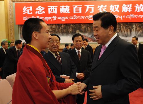 中新网北京3月27日电 纪念西藏百万农奴解放50周年座谈会27日在北京人民大会堂举行。中共中央政治局常委、全国政协主席贾庆林出席并讲话。