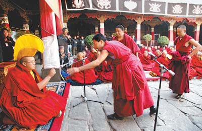 4月12日,来自西藏格鲁派七大寺庙的9名考僧,在拉萨大昭寺通过严格考评,获得了藏传佛教传统最高学位——格西拉让巴,近似于博士学位。图为参加晋升格西拉让巴学位活动的考僧(左)与僧侣之间展开激烈的辩论。(张帆 朱磊摄影报道)