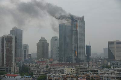 4月19日上午,南京市山西路军人俱乐部内的中环国际大厦发生大火,大火从大楼南侧底部开始燃烧,11点15左右消防车才到现场,至11点半,大楼顶部开始着火燃烧,目前还不清楚是否有伤亡。记者发稿前,南京市全市四面八方响起了消防车的警报声。(本网记者 丁国锋)