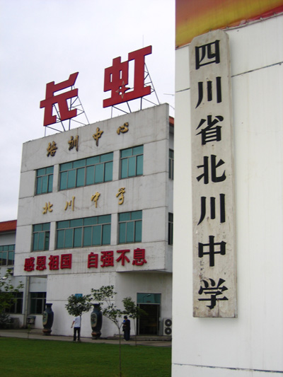 “5.12”地震中,北川中学的2800多名师生里有上千人遇难。除了一栋老教学楼,校舍全部倒塌损毁。为了安全,据长虹培训中心主任侯庆国介绍,地震后第二天,学校的很多师生就转移到了绵阳市九州体育馆。后来在长虹集团的帮助下,北川中学于5月19日在其培训中心复课。复课仪式上,长虹集团送来了从学校废墟中找到的校牌——这段故事已成为佳话。