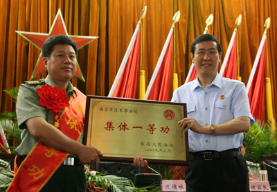 今天(6月18日)上午,南京军区政治部召开庆功大会,隆重庆贺南京军区军事法院被最高人民法院记集体一等功。最高人民法院党组副书记、常务副院长沈德咏出席大会,为南京军区军事法院颁发奖牌并讲话。沈德咏指出,南京军区军事法院是高举旗帜、听党指挥的标兵,是围绕中心、服务大局的典型,是牢记宗旨、司法为兵的楷模,是恪尽职守、公正司法的榜样。不仅是军事法院系统的一面旗帜,也是全国各级人民法院学习的榜样。