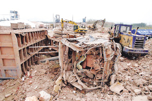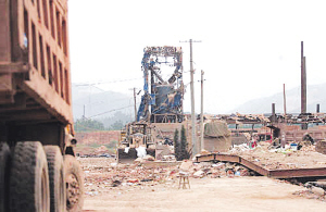 厂区四周的围墙已经多处出现了爆破后的破损,厂子的西围墙部位,被掀翻后的办公楼的混凝土砸出了近20米的缺口,破损的石块下,不时还可以看到被撕破的衣服和鞋子等物。工厂大门口,一辆轿车被冲击波完全击碎,连什么品牌都无法辨认。