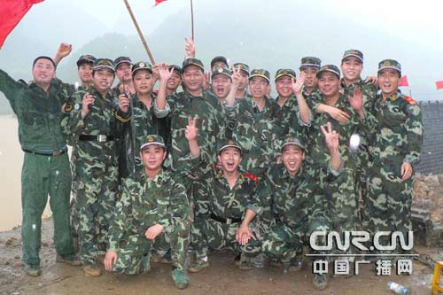 17时30分,当最后一道挡墙被第三次爆破瞬间瓦解时,泄洪槽终于全线打通。17时35分,水电官兵利用反铲清理最后一批石碴,至17时45分,蓄势多时的洪水,终于按照水电官兵的计划和意愿,渲泻而下。至此,卡马水库第一阶段的抢险战斗取得了初步胜利,为缓解卡马水库近800万立方米洪水对下游众多仫佬族同胞生命财产造成严重威胁起到重要作用。