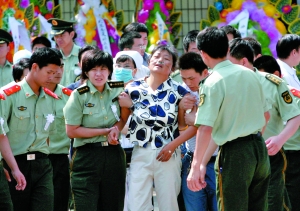 现场工作人员说,张母得知儿子牺牲的消息后,情绪一直不稳定。有人怕她受刺激建议她不要来参加追悼会,但她坚持要见儿子最后一面,所以才安排急救车和医护人员陪同。