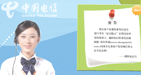 “你拖欠话费,我曝光你!”为了能顺利地追缴话费,中国电信邵阳分公司日前作出惊人之举,将邵阳市部分拖欠话费电信用户的个人相关信息公开发布在湖南某网站,并将这一方式称之为“追缴话费行之有效的‘特殊武器’”。