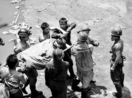 11时35分,施救人员把堵塞该巷道的淤泥和煤块清开,发现里面有3名被困的工人,而且这3名工人还能说话,意识也是清醒的。施救人员立即用黑布将3人的眼睛包裹住,然后每8名救援人员用担架抬起一名被困者,慢慢将他们送至井口。此时,早已闻讯的医务人员来到井口,分别为3名矿工输液,以保持生命体能。