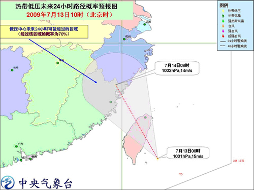 中新网7月13日电 据中国气象局网站消息,中央气象台13日上午发布热带低压消息:目前,台湾东南部海域有一个热带低压活动。今天上午8时,低压中心距离台湾台东市东南方约130公里的海面上,就是北纬22.3度,东经122.3度,中心附近最大风力有7级(15米/秒)。预计低压中心将以每小时25-30公里的速度向西北方向移动,将于今天下午在台东到花莲之间沿海登陆,登陆后强度将有所减弱,然后穿过台湾岛进入台湾海峡,向福建沿海靠近。