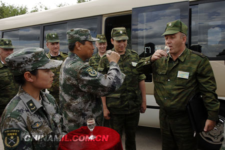 7月11日15时21分,在欢快的迎宾曲和喜庆的鞭炮声中,沈阳军区为“和平使命—2009”中俄联合反恐军事演习双方陆军部队修建的野营村,迎来了俄方首批161名陆军官兵。在野营村正门,野营村管理委员会为来自远方的朋友举行一个庄重的欢迎仪式,野营村管理委员会主任顾炳荣少将举起迎宾美酒并致辞欢迎俄方陆军官兵的到来,与俄方陆军格里少将欣然对饮而尽,现场响起阵阵热烈友好的掌声。之后,在野营村管理委员会机构成员的引导陪同下,俄方官兵秩序井然来到俄方营区。