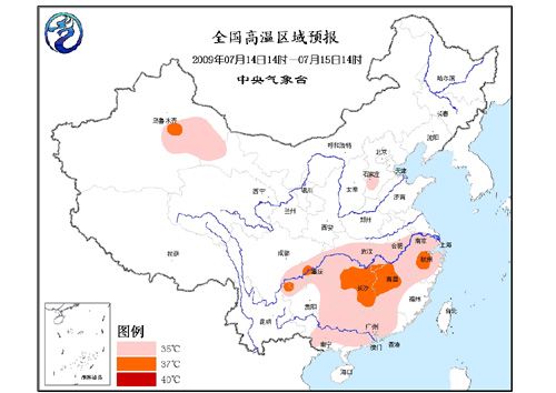 中新网7月14日电 据中国气象局网站消息,中央气象台14日继续发布高温橙色警报:预计,今天下午到明天中午,江淮南部和西部、江汉大部、江南大部、华南中北部、四川盆地东部、重庆、贵州东部、南疆东部等地将有35℃以上的高温,其中,湖南中东部、江西西北部、浙江西北部、重庆西南部以及吐鲁番盆地等地的部分地区最高气温可达37~38℃。
