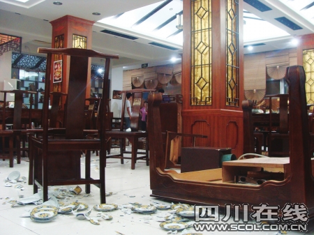 洪雅县招商局局长冷国民,带着10余位亲朋好友,也在该店“青衣江”包间内用餐。饭后结账时,冷国民一行与收银员在签单上出现分歧,随之发生口角。当冷国民让司机现金结清账单后,其所带男性客人在赶来“救场”的3名男子的带领下,砸烂店内桌椅、碗碟等,打伤两名店员。