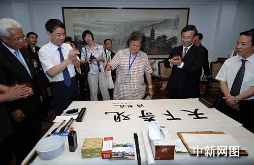 在观看日全食版钱塘潮后,诗琳通盛赞“非常好”。在现场人员的掌声中,诗琳通还以毛笔亲自书写了“天下奇观”四个大字。