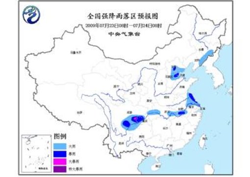 中新网7月23日电 中央气象台23日06时继续发布暴雨预报:预计,今天白天到夜间,四川盆地中南部、重庆西部和东北部、湖北西部和东南部、安徽南部、江苏大部以及河北东部、京津地区、吉林东南部、 辽宁东部等地的部分地区有大到暴雨。其中,四川盆地中部的局部地区有大暴雨。