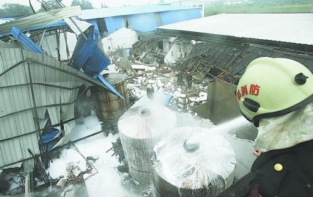 走进厂区,浓重的气味让人难以忍受,爆炸的厂房顶部已完全坍塌,约三层高的墙体因气浪冲击已倾斜,消防员不敢在正下方站着,以防其突然倒塌伤人。废墟中竖立着两个容量10吨的罐体,调来的泡沫正不断对其覆盖。消防员透露,从一大早开始,光泡沫就打了好几万元,最触目惊心的是厂房的铁皮大门,已被炸得完全变形扭曲,足可见当时的爆炸冲击力。